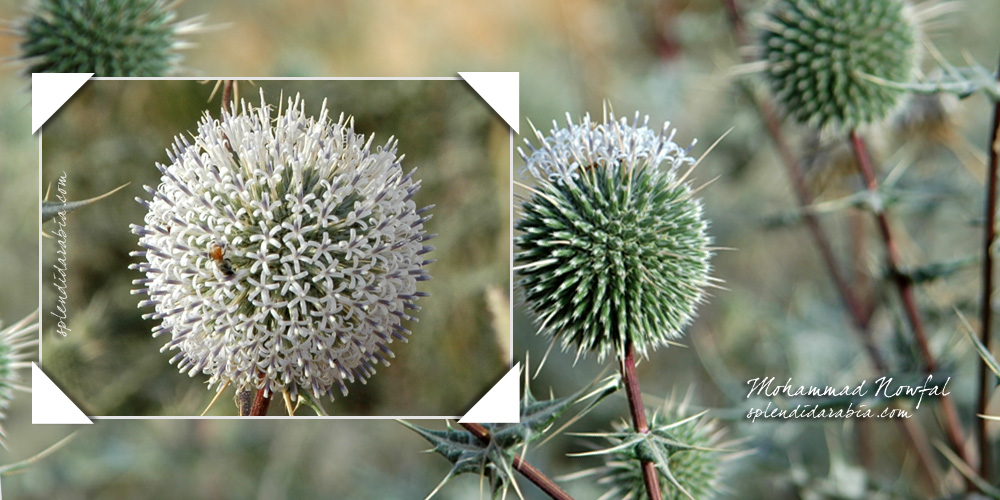 An erect branching spiny-leaved herb 1m high; very pale blue flowers in spherical heads 4cm wide; faint sweet scent; the spines do not extend beyond the open flowers and the stems are pale brownish. Widespread in the region.